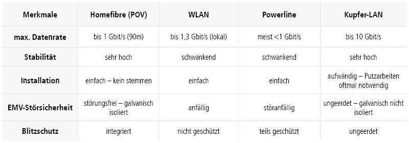 Hier sehen Sie die Technologien Homefibre, WLAN, Powerline und Kupfer-LAN im Überblick – inklusive ihrer wichtigsten Merkmale.